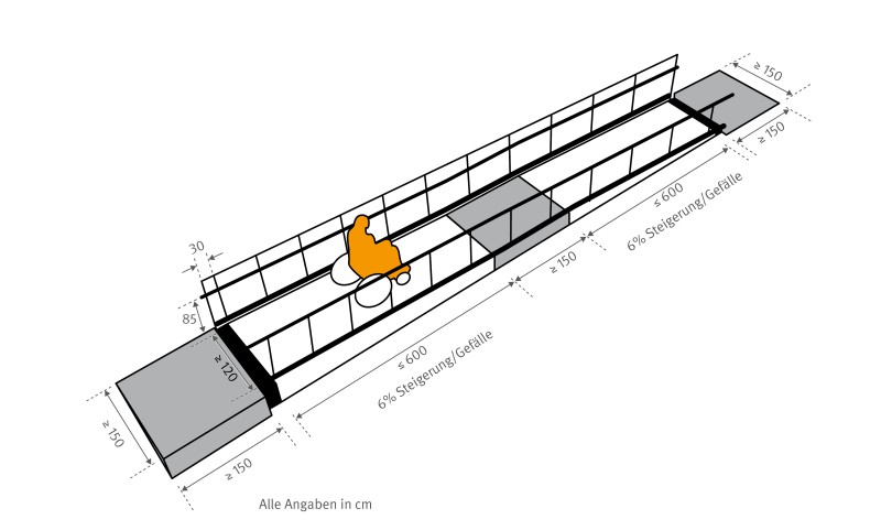 Die Abbildung zeigt eine Rampe mit den einzuhaltenden Mindestmaßen. Die Rampe darf danach eine max. Steigung von 6% haben. Am Anfang und am Ende der Rampe wird die erforderliche freie Verkehrsfläche von 150 cm x 150 cm gezeigt. Die Mindestbreite der Rampe beträgt 120 cm. Rampenläufe dürfen max. 6 m lang sein. Danach muss ein Podest vorgesehen werden, das mindestens 150 cm lang ist.