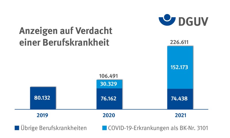 So gingen im vergangenen Jahr insgesamt 226.611 Verdachtsanzeigen auf eine Berufskrankheit bei den Berufsgenossenschaften und Unfallkassen ein. Das sind mehr als doppelt so viele wie 2020, das selbst schon ein Ausnahmejahr war. Davon betrafen gut 150.000 Verdachtsanzeigen COVID-19. Bei den Anerkennungen aller Berufskrankheiten insgesamt ist der Anstieg noch größer: Hier verdreifachte sich der Wert gegenüber 2020 auf insgesamt 123.228 anerkannte Berufskrankheiten. Bei etwa 100.000 dieser Fälle handelte es sich um eine Erkrankung an COVID-19.