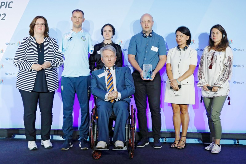 v.l.n.r: Laudatorin Kerstin Griese (Parlamentarische Staatssekretärin im BMAS) mit Semenenko Yaroslav, paralympischer Schwimmer, dem Präsidenten des paralympischen Komitees der Ukraine, Valerii Sushkevych (sitzend), sowie der ukrainischen Delegation. (Foto: Jan Röhl / DGUV)