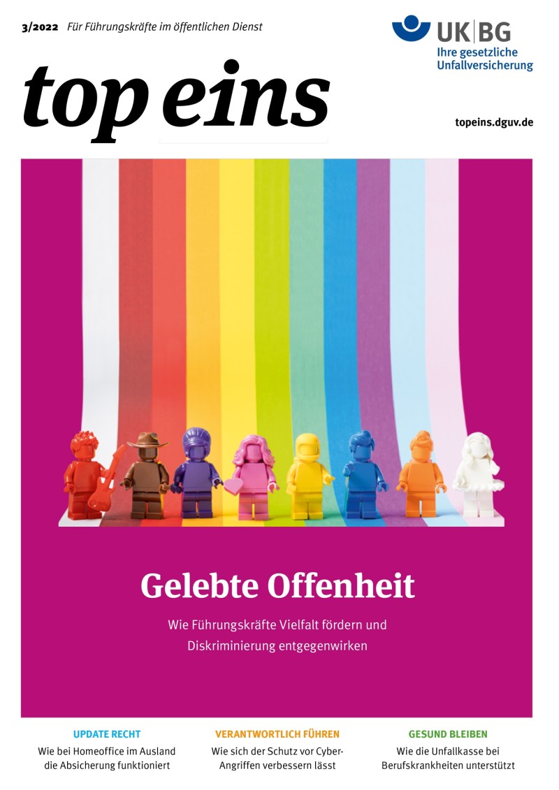 "top eins" bietet praxisrelevante Informationen und Tipps für Führungskräfte im öffentlichen Dienst. Das Magazin erscheint viermal im Jahr und wird von bestimmten Unfallkassen kostenfrei an die bei ihnen versicherten Einrichtungen geschickt. Weitere Interviews, Hintergrundartikel und Neuigkeiten zu spannenden Themen erhalten Führungskräfte auf topeins.dguv.de