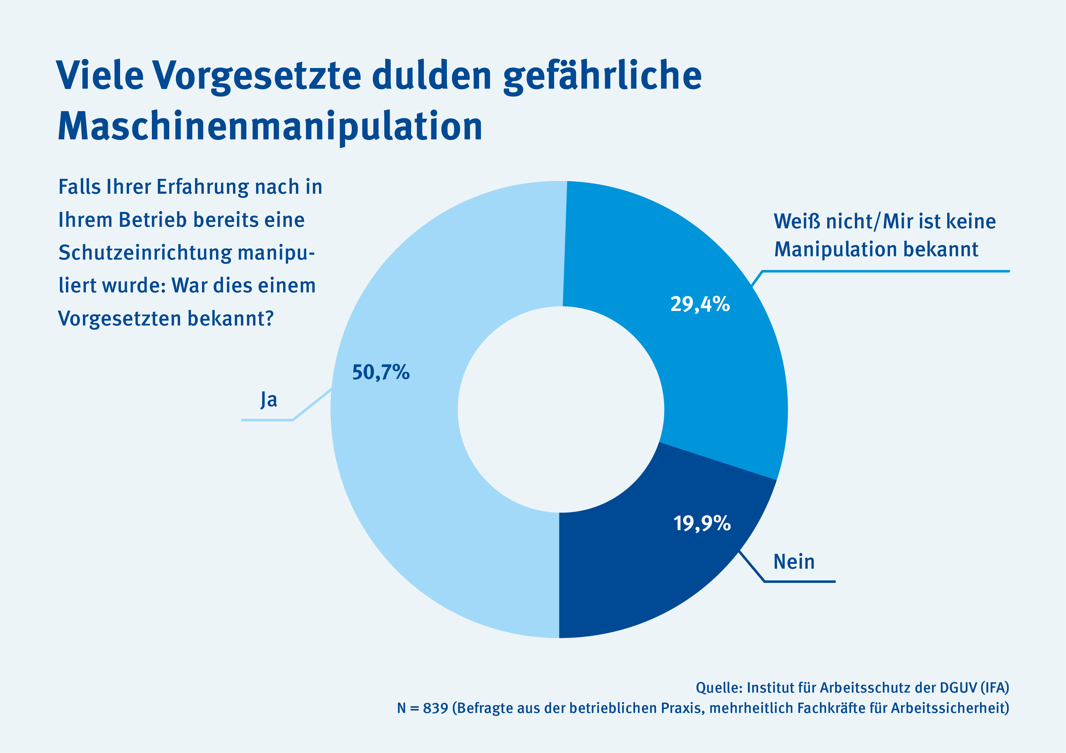Schätzungen gehen davon aus, dass etwa 10.000 teils tödliche Arbeitsunfälle jedes Jahr die Folge manipulierter Schutzeinrichtungen an Maschinen sind. Manipuliert wird, wenn Schutzeinrichtungen den Arbeitsablauf stören. Um das aktuelle Ausmaß des Problems zu konkretisieren, hat das IFA zwischen Ende 2019 und Sommer 2022 über 840 Personen befragt, die im Betrieb mit Arbeitsschutzbelangen betraut sind, mehrheitlich Fachkräfte für Arbeitssicherheit, aber auch Führungskräfte.