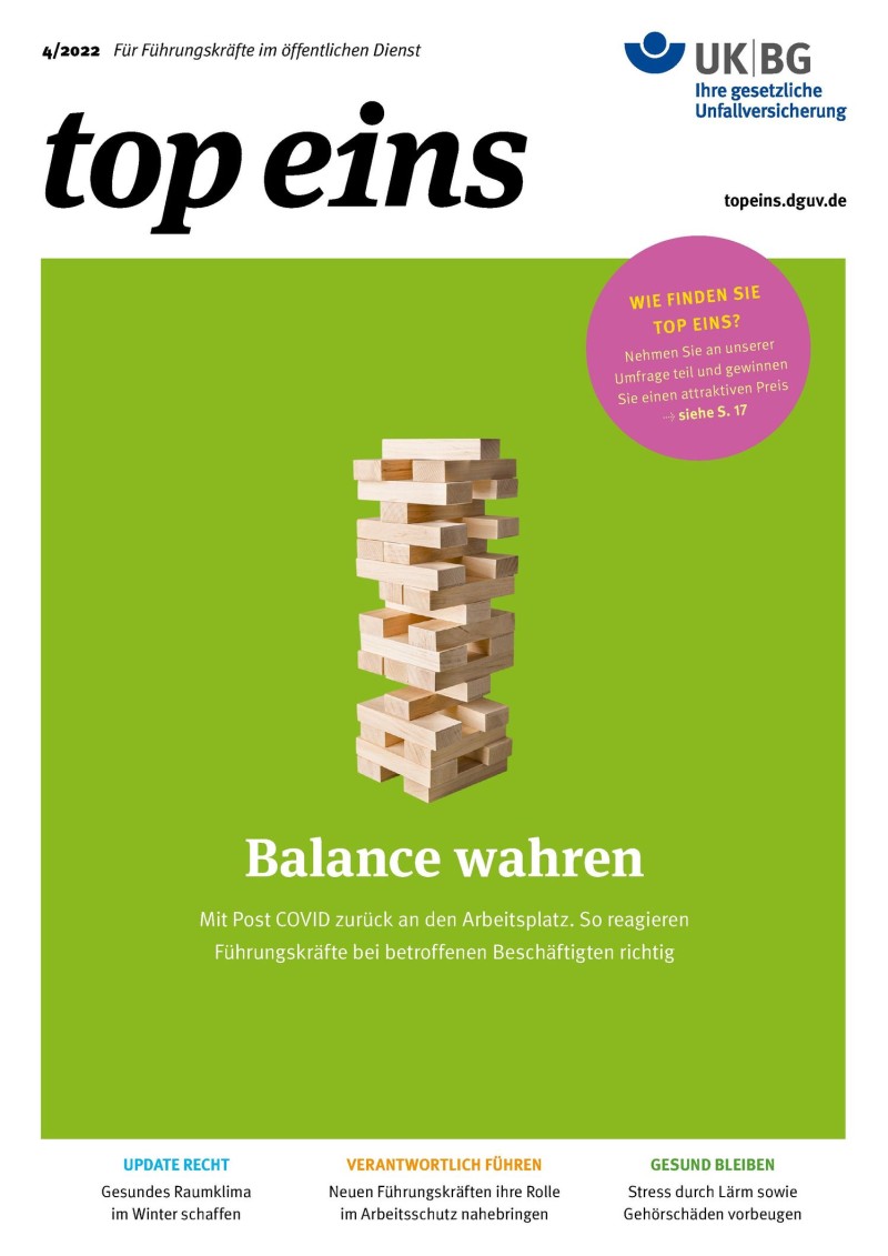 "top eins" bietet praxisrelevante Informationen und Tipps für Führungskräfte im öffentlichen Dienst. Das Magazin erscheint viermal im Jahr und wird von bestimmten Unfallkassen kostenfrei an die bei ihnen versicherten Einrichtungen geschickt. Weitere Interviews, Hintergrundartikel und Neuigkeiten zu spannenden Themen erhalten Führungskräfte auf topeins.dguv.de.