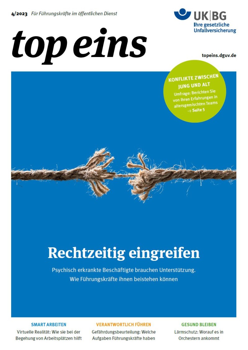 "top eins" bietet praxisrelevante Informationen und Tipps für Führungskräfte im öffentlichen Dienst. Das Magazin erscheint viermal im Jahr und wird von bestimmten Unfallkassen kostenfrei an die bei ihnen versicherten Einrichtungen geschickt. Weitere Interviews, Hintergrundartikel und Neuigkeiten zu spannenden Themen erhalten Führungskräfte auf topeins.dguv.de.