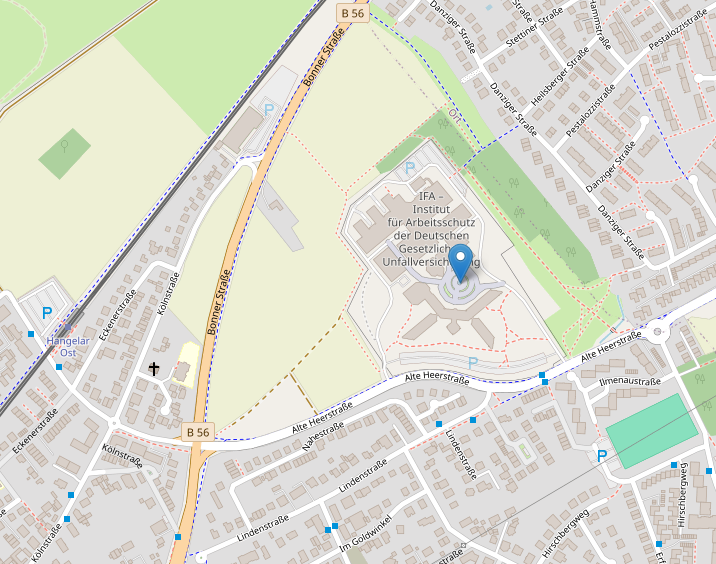 Ab Siegburg oder Bonn Hauptbahnhof mit der Stadtbahn-Linie 66 (Bonn - Siegburg) bis Haltestelle Hangelar-Ost. ca. 15 Minuten Fußweg - Alte Heerstraße - , Hinweisschild DGUV, Eingang links.