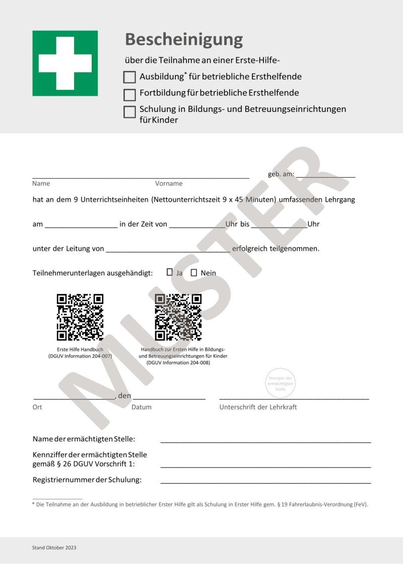 • Titel: Bescheinigung über die Teilnahme an einer Erste-Hilfe-Aus- bzw. Fortbildung für betriebliche Ersthelfende/oder an der Ersten-Hilfe- Schulung in Bildungs- und Betreuungseinrichtungen für Kinder