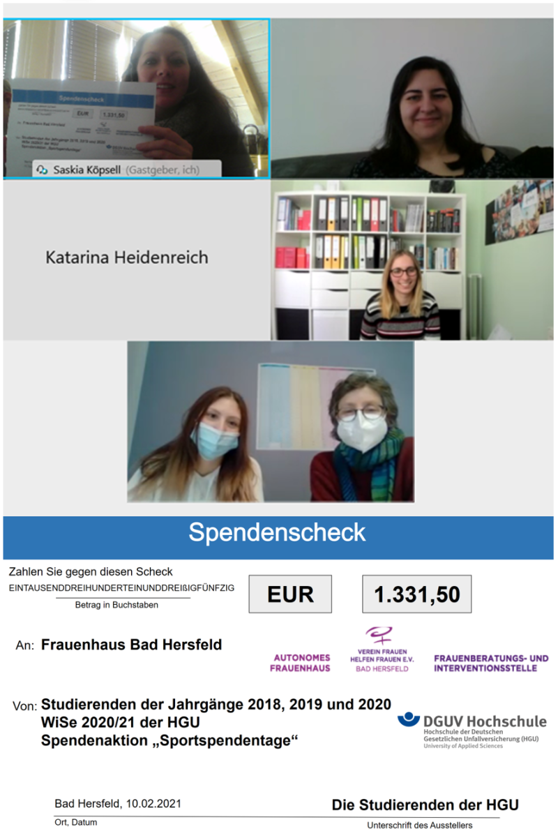 Die Studierenden haben sich dazu entschieden, mit dem Betrag eine regionale soziale Einrichtung zu unterstützen. Corona hat die Welt verändert, das gilt besonders für Frauen und Kinder, die körperliche, seelische oder sexuelle Gewalt erfahren oder davon bedroht sind. Im Frauenhaus Bad Hersfeld wird ihnen Schutz, Beratung und Raum gewährt, um ihre Situation zu bewältigen. Die Studierenden der HGU schätzen diese Tätigkeiten sehr und freuen sich, den gesammelten Geldbetrag an das Frauenhaus in Bad Hersfeld spenden zu können. Die Spendenübergabe fand am 10.02.2021 digital statt.