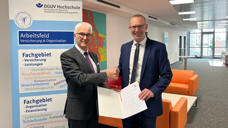 Anfang Oktober 2023 erhielt Dr. Eric Zimmermann die Berufungsurkunde des Hessischen Ministeriums für Wissenschaft und Kunst auf die Professur für Sozialrecht, Schwerpunkt Leistungen der gesetzlichen Unfallversicherung, an der Hochschule der DGUV (HGU) aus den Händen von Rektor Prof. Becker.