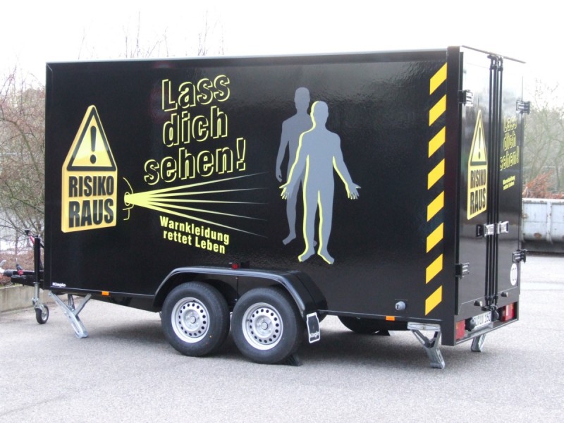 Die Innenansicht des Pkw-Anhängers erlaubt die Simulation von Straßenszenen und veranschaulicht die Sichtbarkeit von Warnkleidung
