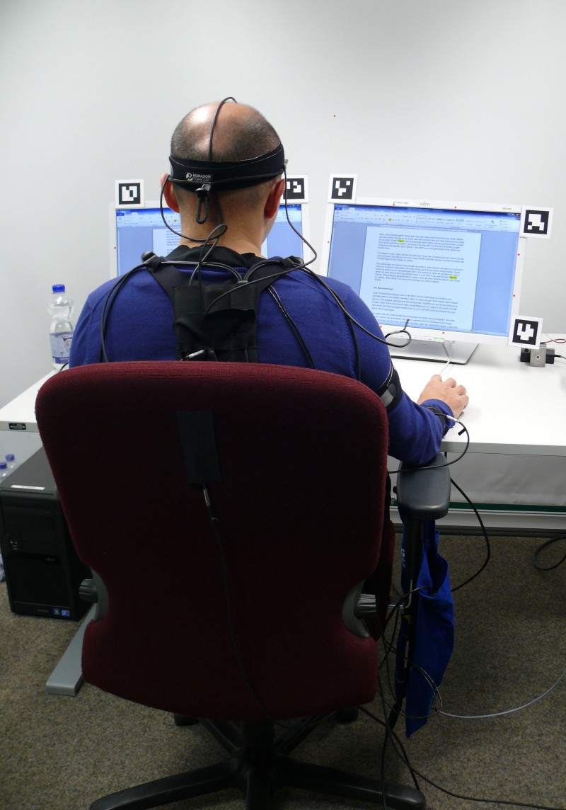 Mit Messsystem ausgestatteter Proband bei der Arbeit an zwei Bildschirmen