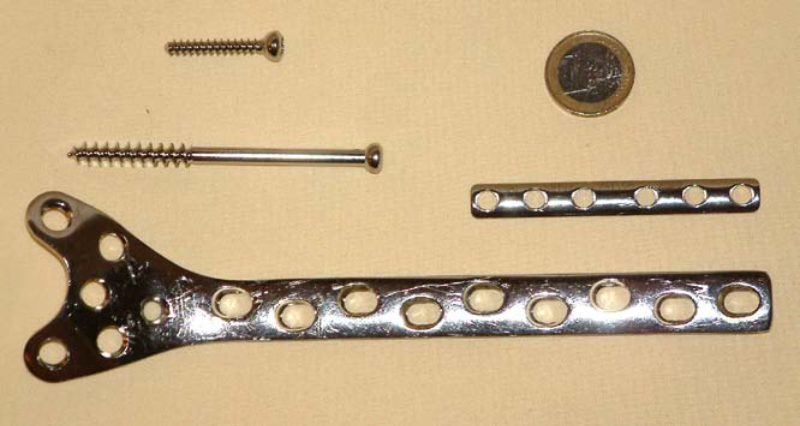 Beispiele für passive Implantate: Knochenschrauben sowie Metallplatten zur Plattenosteosynthese
