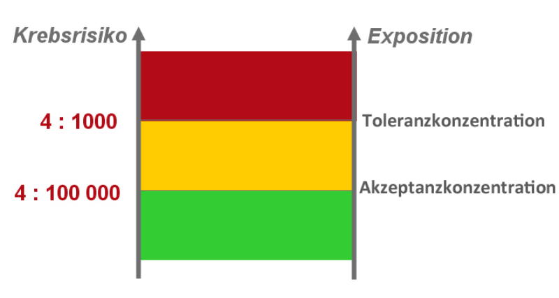 Das Risikokonzept definiert drei Risikobereiche – hohes, mittleres und geringes Risiko. Die Grenze zwischen hohem Risiko (roter Bereich) und mittlerem Risiko (gelber Bereich) wird als Toleranzrisiko bezeichnet. Das Toleranzrisiko entspricht einem statistischen zusätzlichen Krebsrisiko von 4:1.000, bei dem statistisch die Wahrscheinlichkeit besteht, dass von 1.000 während des gesamten Arbeitslebens exponierten Personen vier an Krebs erkranken.