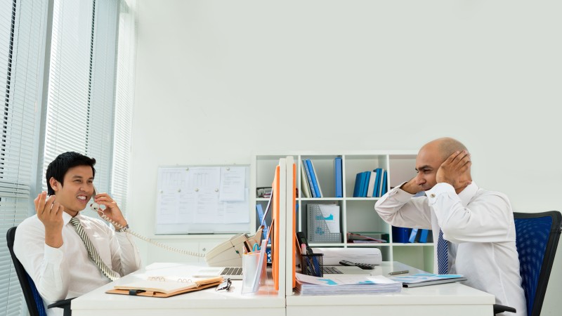 Ein Mann im Büro telefoniert und lacht, der Kollege hält sich die Ohren zu