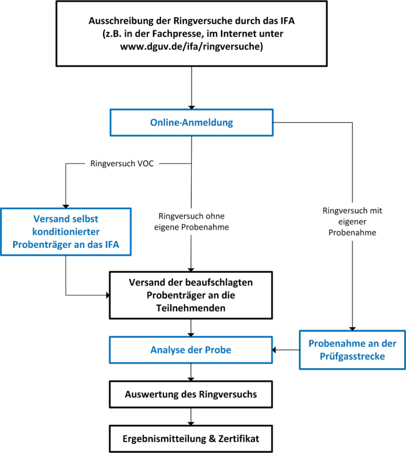 Die Organisation und Durchführung der Ringversuche einschließlich der Auswertung und Dokumentation der Ergebnisse übernimmt das IFA. Die angebotenen Ringversuche sollen eine möglichst breite Palette an Gefahrstoffen abdecken. Sie werden wahlweise mit eigener Probenahme oder ohne eigene Probenahme angeboten – mit Ausnahme des Ringversuchs Metalle, der nur ohne eigene Probenahme stattfindet. Das heißt, die Teilnehmenden erhalten fertig beaufschlagte Proben zugeschickt oder sie beaufschlagen ihre Probenträger an der dynamischen Prüfgasstrecke des IFA selbst. Nach DIN EN 482 gilt für Messverfahren am Arbeitsplatz in der Regel ein Mindestmessbereich vom 0,1-fachen bis zum 2-fachen Arbeitsplatzgrenzwert (AGW) [6, 7]. Die bei den Ringversuchen eingestellten Konzentrationsbereiche richten sich in der Regel nach dieser Vorgabe . Abweichungen davon sind bei den einzelnen Ringversuchsunterseiten beschrieben. Informationen zu den Grenzwerten enthält die Datenbank GESTIS - International Limit Values [8]. Die verschiedenen Ringversuche werden jeweils einmal jährlich durchgeführt, zu unterschiedlichen Terminen. Ihr Ablauf ist stets ähnlich (siehe Abbildung Ablaufschema). Die Herstellung der Proben erfolgt entweder im IFA oder im Institut für Gefahrstoff-Forschung (IGF) der Berufsgenossenschaft Rohstoffe und Chemische Industrie (BG RCI) in Dortmund.