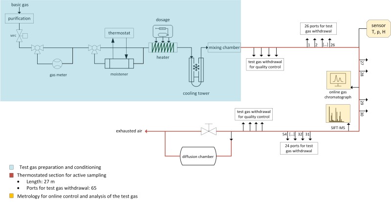 The quality of the test gas is ensured with the help of various online measuring techniques. Temperature and humidity in the test gas facility are continuously monitored and controlled, and the air pressure in the laboratory is also recorded.