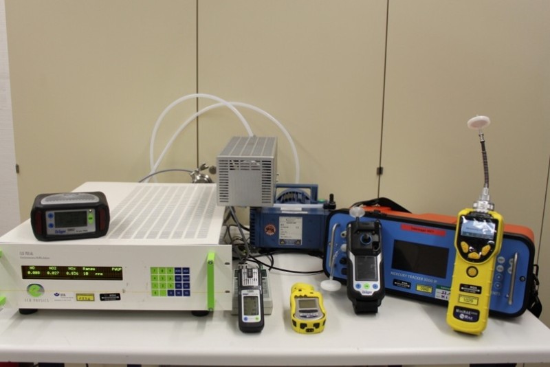 Several direct-reading instruments and test devices are placed on a laboratory table, including portable gas detectors and a stationary analyzer for hazardous substance measurements.