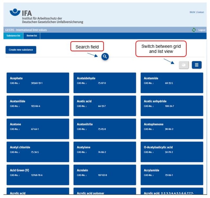When the GESTIS-ILV database is opened, the substances listed are displayed in alphabetical order, in either grid or list view. This can be selected by means of the button at the top on the right (see Figure 1).