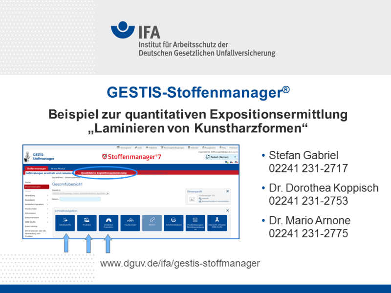 Bitte richten Sie Fragen, Anregungen, Kommentare oder Ergänzungen zu den hier angebotenen Vorträgen und Anwendungsbeispielen an gestis-stoffenmanager@dguv.de.