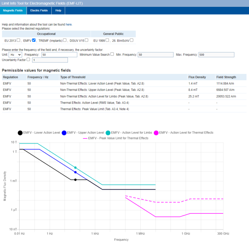 To facilitate the process in general and determination of which values are appropriate, EMF experts at the German Social Accident Insurance have developed the Limit Info Tool for Electromagnetic Fields (EMF-LIT). This web application was developed jointly by the IFA and the German Social Accident Insurance Institutions for the energy, textile, electrical and media products sectors (BG ETEM), the woodworking and metalworking industries (BGHM), the trade and distribution industry (BGHW) and the raw materials and chemical industry (BG RCI).
