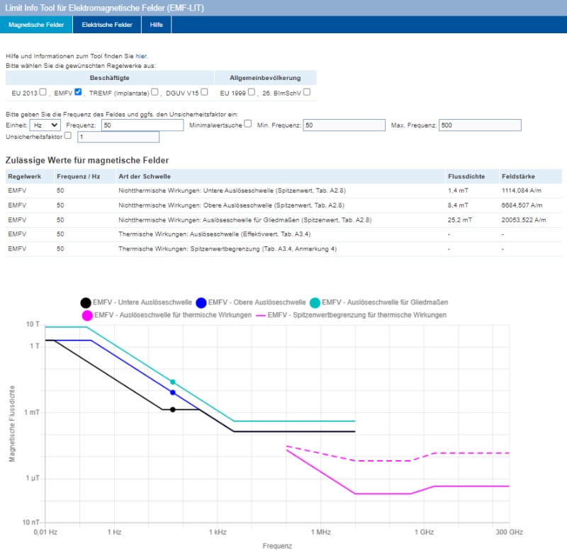 Auf der Startseite der Software kann zwischen den Reitern "Magnetische Felder", "Elektrische Felder" und "Hilfe" gewählt werden. Es lässt sich entweder eine einzelne Frequenz oder ein Frequenzbereich angeben und die gewünschte Einheit einstellen. Darüber hinaus kann ein Unsicherheitsfaktor bei der Berechnung der zulässigen Werte in der Tabelle berücksichtigt werden.