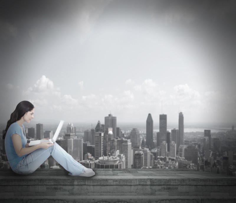 Frau hält Laptop auf den Knien