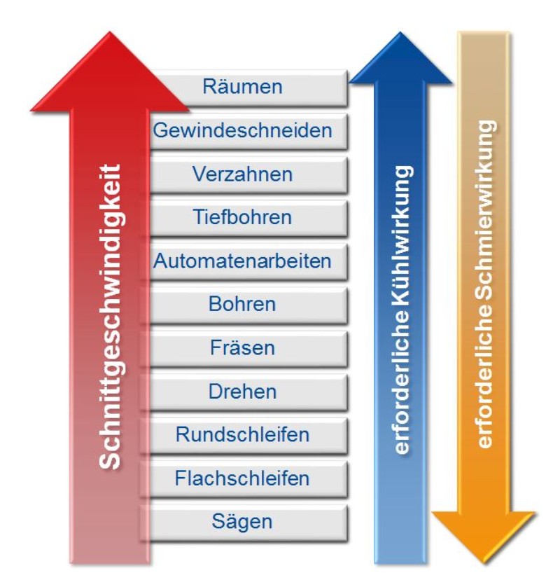 Durch die Verwendung eines für das jeweilige Verfahren optimal abgestimmten Kühlschmierstoffes lässt sich neben einer Verbesserung der Oberflächengüte des Werkstückes eine Erhöhung der Bearbeitungsgeschwindigkeit und eine Steigerung der Werkzeugstandzeit bei gleichzeitiger Senkung der Betriebskosten erreichen.