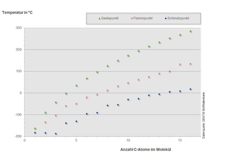 Mit zunehmender Kettenlänge (Kohlenstoffzahl) steigen die Siede- und Flammpunkte der n-Alkane stetig an. Ab einer Kettenlänge von drei Kohlenstoffatomen (Propan) nehmen auch die Schmelzpunkte mit zunehmender Kohlenstoffzahl kontinuierlich zu (s. Bild 2). In der Gruppe der i-Alkane (verzweigte, gesättigte Kohlenwasserstoffe) besteht kein eindeutiger Zusammenhang zwischen der Anzahl der Kohlenstoffatome und den Siede- bzw. Schmelzpunkten. Allgemein lässt sich aber feststellen, dass die Siedepunkte immer und die Schmelzpunkte oft tiefer liegen als bei den entsprechenden n-Alkanen. Außerdem nimmt der Siedepunkt bei gleicher Anzahl an Kohlenstoffatomen mit zunehmender Verzweigung ab.
