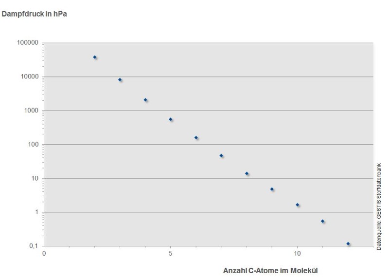 Bild 3: Dampfdrücke verschiedener n-Alkane in Abhängigkeit von der Kohlenstoffzahl
