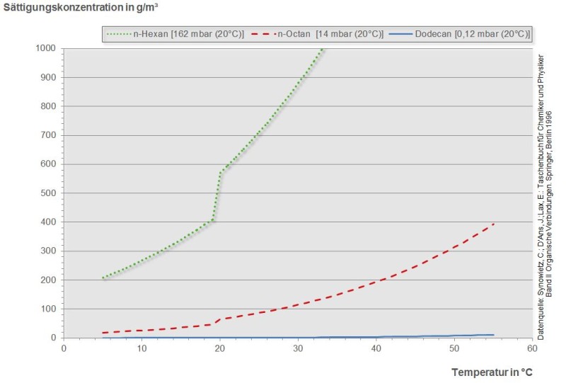 Die Dampfdrücke der Alkane sinken mit steigender Kettenlänge. Während die niedrigsiedenden Kohlenwasserstoffe leicht verdampfen, gehen die höhersiedenden Alkane (mehr als 15 Kohlenstoffatome) bei Raumtemperatur kaum dampfförmig in die Luft über. Dies zeigt sich auch, wenn der Dampfdruck gegen die Anzahl der Kohlenstoffatome im Molekül aufgetragen wird (s. Bild 3). Dementsprechend nimmt auch die Sättigungskonzentration der Alkane in Luft mit steigender Kettenlänge ab. Je kürzer das Kohlenstoffgerüst ist, desto größer ist auch die Sättigungskonzentration. Die Werte hängen dabei stark von der Temperatur ab (s. Bild 4). Aufgrund des exponentiellen Verlaufs, steigen die Sättigungskonzentrationen zunächst langsam, dann aber steil mit der Temperatur an. So beträgt die Sättigungskonzentration für Hexadecan (C16H34), einen bei Raumtemperatur festen Stoff, bei 30 °C schon 15 mg/m3. Für Octan (C8H18) liegt die Sättigungskonzentration bereits bei Raumtemperatur im Gramm-pro-Kubikmeter-Bereich.