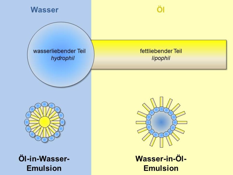 Emulgatormoleküle bestehen aus einem hydrophilen (Wasser liebend) und einem lipophilen (Fett liebend) Teil. Sie richten sich an der Grenzfläche zwischen Wasser und Öl so aus, dass der lipophile Teil in die Ölphase und der hydrophile Teil in die Wasserphase ragen. Es bildet sich ein Grenzflächenfilm aus, der die Grenzflächenspannung erniedrigt.