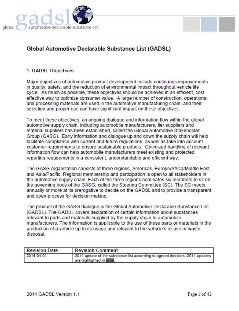 Die Global Automotive Declarable Substance List wird jährlich in Zusammenarbeit von Automobilherstellern, Zulieferern und Rohstoffherstellern herausgegeben. Sie enthält alle deklarationspflichtigen Stoffe,