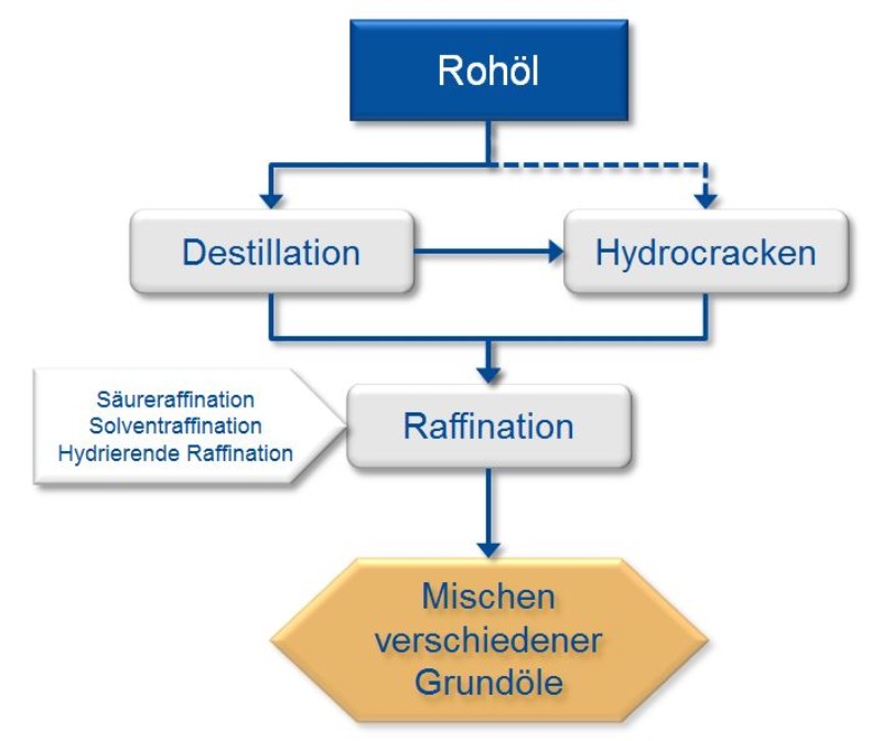 Die Herstellung von Mineralölen für die Anwendung als Kühlschmierstoff erfolgt zumeist nach dem im Bild dargestellten Übersichtsschema. In der Praxis sind die Verfahren allerdings sehr viel komplexer und auch der Verfahrensablauf variiert je nach Anlage.