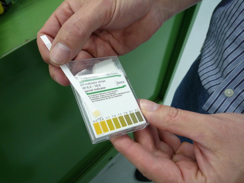Sinkt der pH-Wert von wassergemischten Kühlschmierstoffen, so besteht die Gefahr, dass unter anderem die Beständigkeit der Emulsion sowie die Leistungsfähigkeit des Korrosionsschutzes beeinträchtigt werden. Daneben deutet ein Absinken des pH-Wertes auf ein erhöhtes Keimwachstum hin.