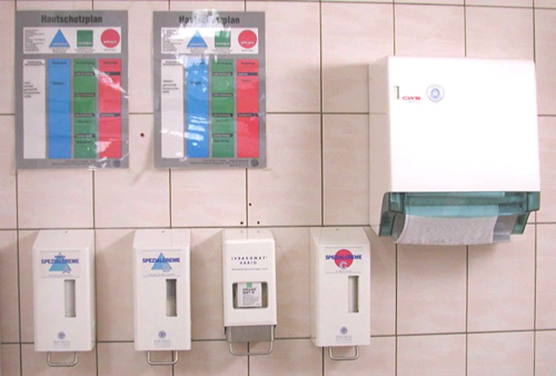 Die Hautschutz-, Hautreinigungs- und Hautpflegemittel sollten in speziellen Spendern mit austauschbaren Kartuschen am Waschplatz zur Verfügung gestellt werden (siehe Bild 3). Um Verwechslungen auszuschließen, müssen die Spender ausreichend und richtig beschriftet sein. Eine farbliche Markierung – ggf. mit Piktogrammen – hat sich in der Praxis bewährt.