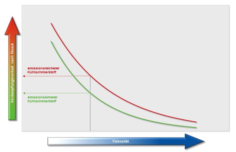 Grundsätzlich sind möglichst emissionsarme KSS einzusetzen. Gemäß IFA Report 6/2015 sollte dazu bei einer vom Bearbeitungsverfahren vorgegebenen Viskosität derjenige Kühlschmierstoff verwendet werden, der den geringsten Verdampfungsverlust nach Noack aufweist (s. Bild 2). Durch die Auswahl emissionsärmerer Basisstoffe (Hydrocracköle, Solventraffinate, Esteröle) kann das Verdampfen des Kühlschmierstoffes erheblich reduziert werden. Es ist zu beachten, dass einige wenige Spezialprodukte niedrigsiedende Komponenten (z. B. Kohlenwasserstoffe, Chlorkohlenwasserstoffe) enthalten können.