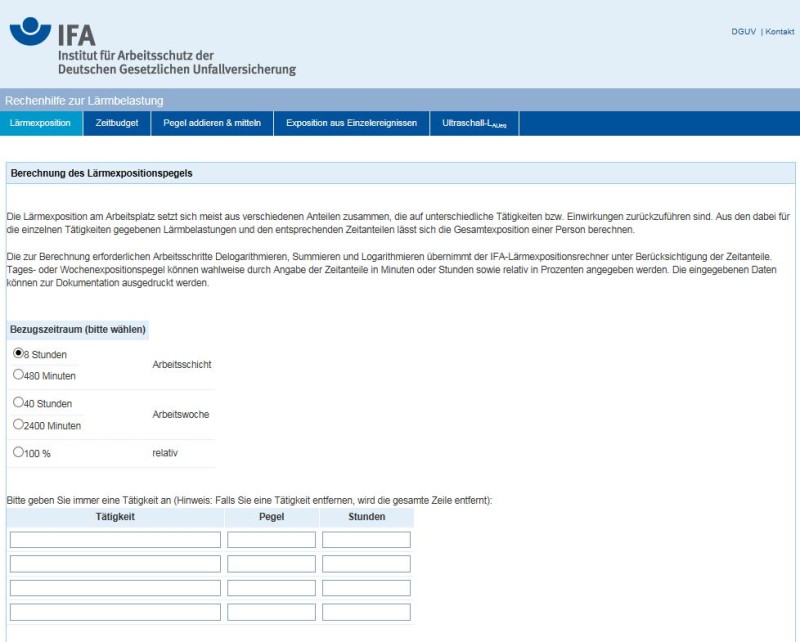 Die zur Berechnung erforderlichen Arbeitsschritte Delogarithmieren, Summieren und Logarithmieren kann der Lärmexpositionsrechner übernehmen, den das IFA zur Verfügung stellt. Die zur Berechnung des Tages- oder Wochenexpositionspegels nötigen Zeitanteile der einzelnen Tätigkeiten können wahlweise in Minuten oder Stunden sowie relativ in Prozent angegeben werden. Die Daten können zur Dokumentation ausgedruckt werden.