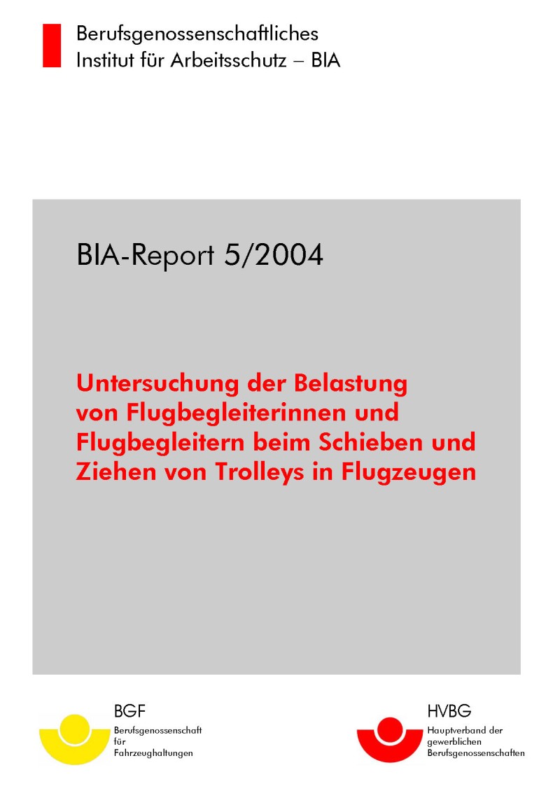 Glitsch, U.; Ottersbach, H.J.; Ellegast, R.P.; Hermanns, I.; Feldges, W.; Schaub, K.; Berg, K.; Winter, G.; Sawatzki, K.; Voß, J.; Göllner, R.; Jäger, M.; Franz, G. Untersuchung der Belastung von Flugbegleiterinnen und Flugbegleitern beim Schieben und Ziehen von Trolleys in Flugzeugen. BIA-Report 5/2004. Hrsg.: Hauptverband der gewerblichen Berufsgenossenschaften (HVBG), Sankt Augustin 2004. ISBN: 3-88383-670-2