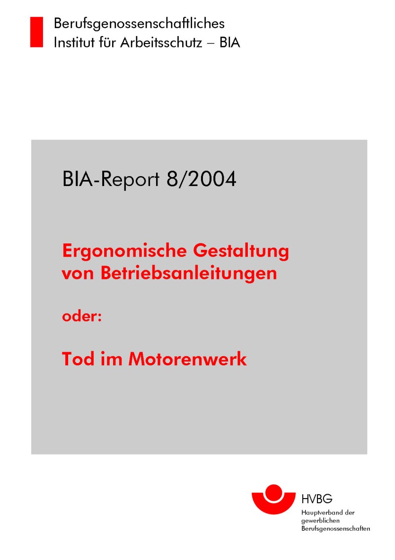 Brun, E.; Reinert, D.: Ergonomische Gestaltung von Betriebsanleitungen oder: Tod im Motorenwerk. BIA-Report 8/2004. Hrsg.: Hauptverband der gewerblichen Berufsgenossenschaften (HVBG), Sankt Augustin 2004. 2. korrigierte Aufl. 2004. ISBN: 3-88383-679-6