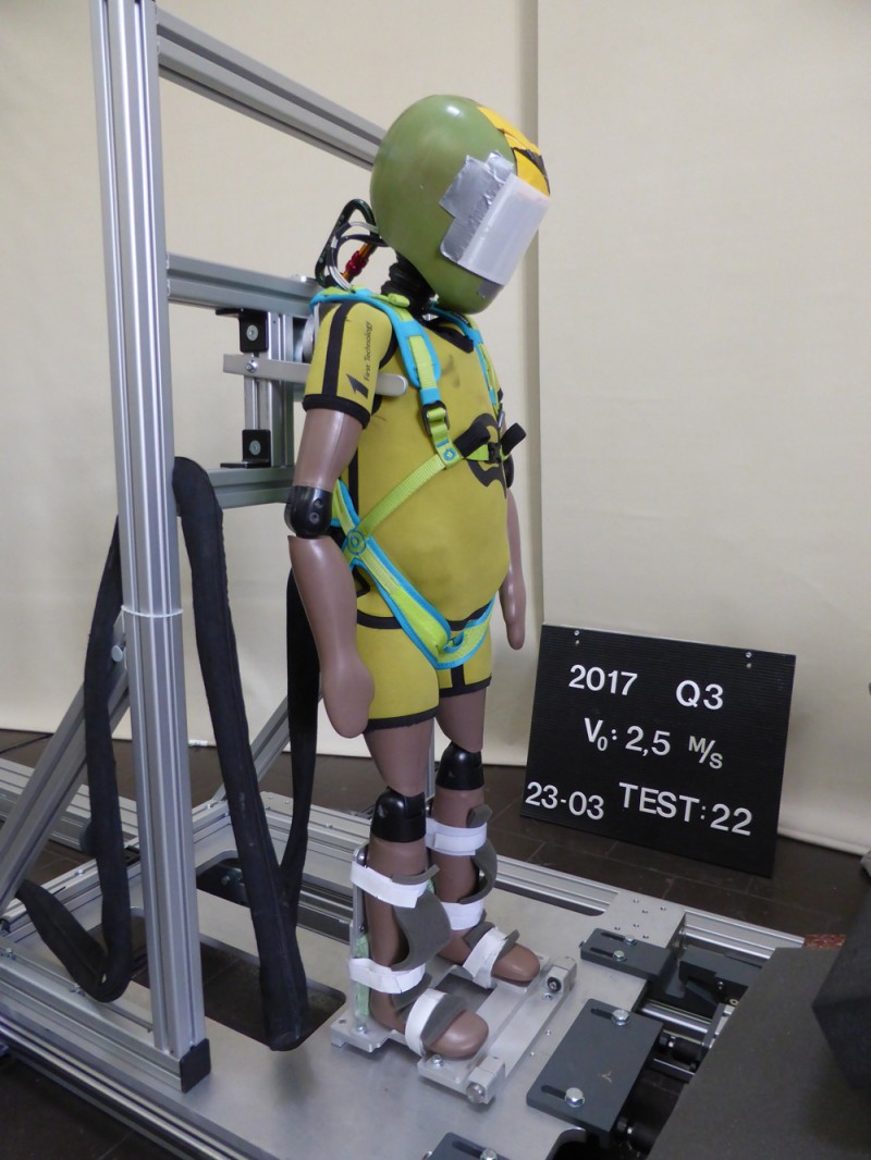 Messeinrichtung mit Stolper- und Aufprallsimulation von Kleinkindern auf Möbelkanten (Crashtest-Dummy)