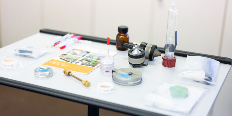 Ein Tisch auf dem sich Probenahmeequipment wie zum Beispiel Probenahmeköpfe und Kartuschen befinden