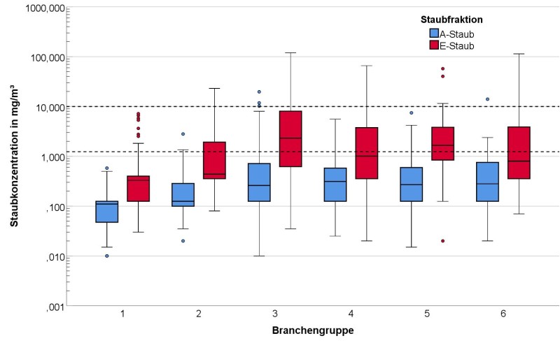 Boxplot zu Staubexpositionsdaten aus der IFA Expositionsdatenbank MEGA