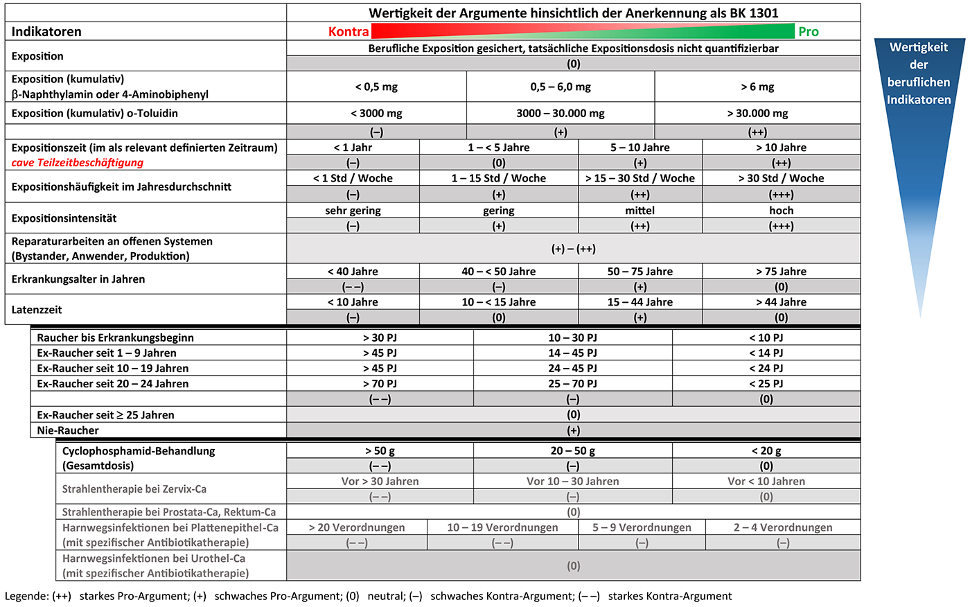BK 1301-Matrix für krebserzeugende aromatische Amine zur Wertung beruflicher und außerberuflicher Risikofaktoren des Harnblasenkarzinoms im Rahmen der Zusammenhangsbegutachtung einer Berufskrankheit nach Nr. 1301. Modifiziert nach Weistenhöfer et al.: Das beruflich bedingte Harnblasenkarzinom – Die BK 1301-Matrix als Algorithmus und Entscheidungshilfe für eine Zusammenhangsbegutachtung. ASU 2022; 3: 177-189