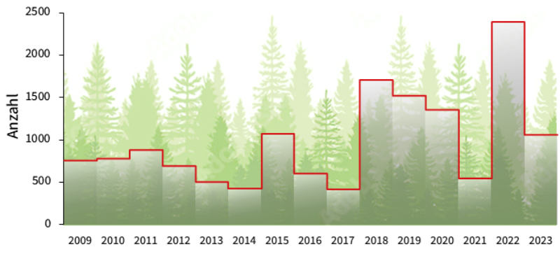 In Deutschland ist in den letzten Jahren eine Zunahme von Vegetationsbränden zu beobachten. Die verbrannte Waldfläche lag im Jahr 2023 um mehr als 40 Prozent über dem langjährigen Durchschnittswert seit dem Jahr 1991 (BEML 2024). Die Waldbrandstatistik des Bundesministeriums für Ernährung und Landwirtschaft zeigt, dass die Anzahl der Waldbrände in den letzten Jahren mehrfach die Grenze von eintausend Bränden überschritten hat (Abbildung 1).
