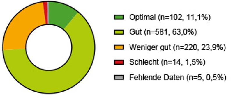 Selbstangaben zur Ausstattung des mobilen Arbeitsplatzes (Sitzgelegenheit, Tisch, Bildschirm, Tastatur und Maus) wurden in einem Ergonomie-Score zusammengefasst. Demnach hatte die Mehrheit der Befragten zum Erhebungszeitpunkt einen guten oder sogar optimal ausgestatten Ort für ihre mobile Tätigkeit (Abbildung 1). 69 Prozent der Homeoffice-Beschäftigten berichtete von einer optimalen Sitzgelegenheit, was einen korrekt eingestellten höhenverstellbaren Bürostuhl umfasst.
