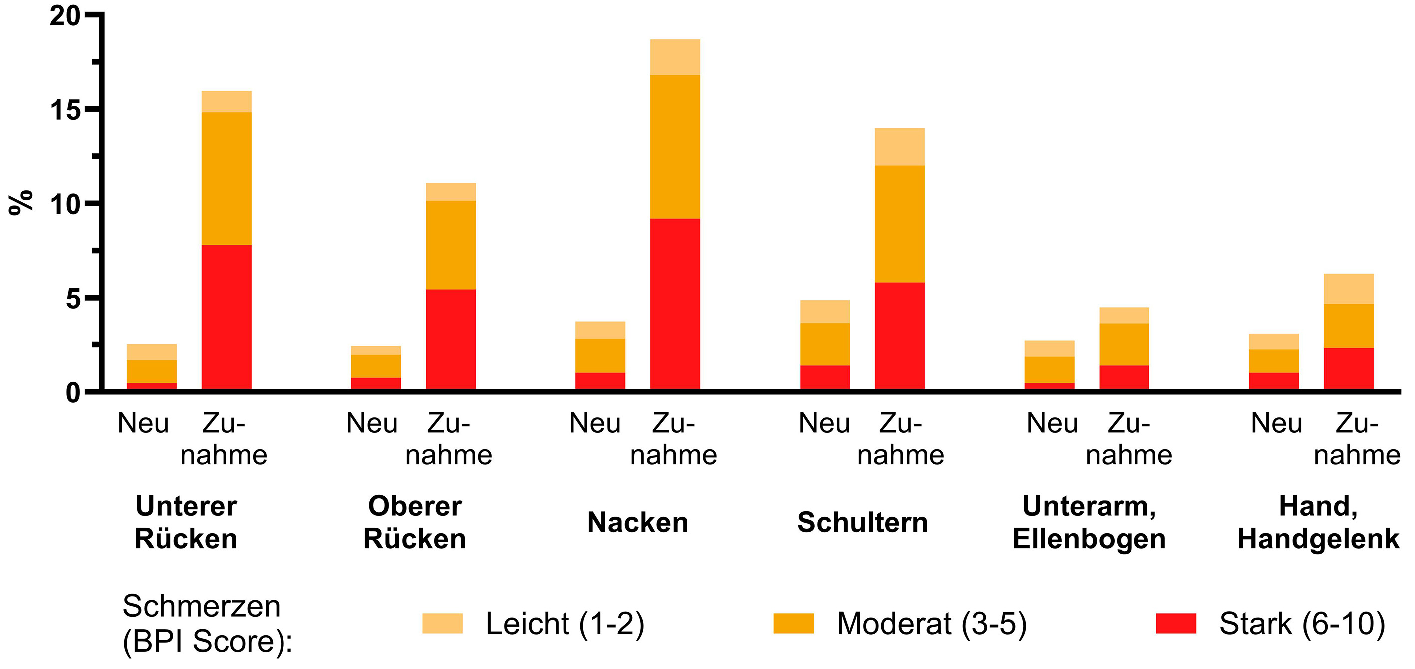 Die Muskel-Skelett-Beschwerden in den Bereichen Schulter, Nacken, obere Extremitäten sowie im Rücken wurden als Schmerzen mit dem Brief Pain Inventory (BPI, Radbruch et al. 1999) erfasst. Dieses standardisierte Instrument ermöglicht die differenzierte Messung der Schmerzintensität auf einer numerischen Ratingskala von 0 (kein Schmerz) bis 10 (stärkster vorstellbarer Schmerz). Die Beschwerden der Teilnehmenden wurden retrospektiv für den Zeitraum vor der Pandemie Anfang 2020 (t0) sowie aktuell für die letzte Woche (t1) erfasst. Eine Zunahme der Beschwerden wurde als Anstieg und eine Abnahme als Verringerung des BPI-Scores um mindestens einen Punkt von t0 zu t1 definiert. Am häufigsten wurden Beschwerden im unteren Rücken und im Nacken berichtet. Die Prävalenz von Muskel-Skelett-Beschwerden stieg leicht für Schulter- und für Ellenbogenschmerz im Pandemieverlauf an, während sie im Bereich des unteren Rückens zurückging (Tabelle 1).