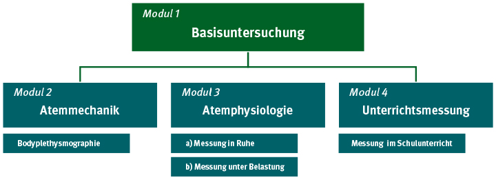 Die IPA-Maskenstudie Schule (→ Abb. 1) wurde durch den Fachbereich Bildungseinrichtungen der DGUV und die Unfallkassen initiiert und in Kooperation mit der Universitätskinderklinik Bochum durchgeführt (→ IPA-Journal 03/2023). Kinder und Jugendliche zwischen 9 und 14 Jahren wurden in drei Modulen hinsichtlich ihrer Atemmechanik (Modul 2), ihrer Atemphysiologie in Ruhe (Modul 3a) und unter körperlicher Belastung (Modul 3b) untersucht. Zudem wurden Unterrichtsmessungen (Modul 4) vorgenommen. Die Untersuchungen fanden jeweils mit zwei zertifizierten Masken im Vergleich zur Situation ohne Maske statt. Bei den verwendeten Masken handelte es sich um einen MNS und eine FFP2-Maske, die jeweils in der Größe XS-S genutzt wurden.