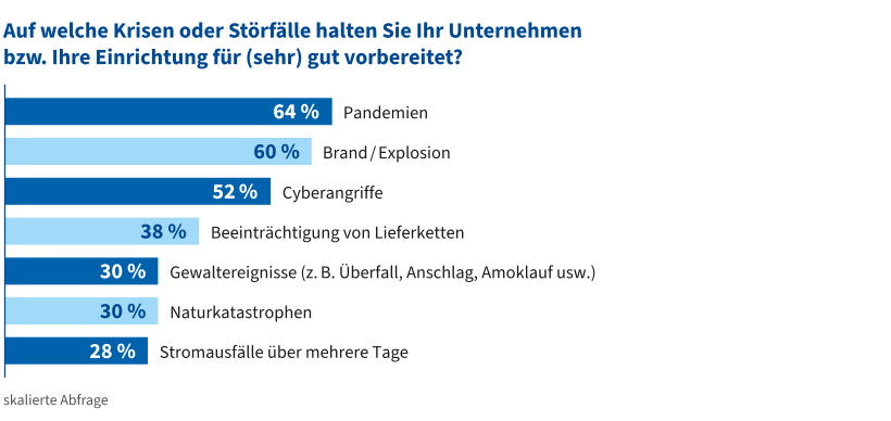 Die Befragten sehen ihre Unternehmen am häufigsten auf Pandemien (64 Prozent), Brände oder Explosionen (60 Prozent) und Cyberangriffe (52 Prozent) gut vorbereitet, seltener dagegen auf die Beeinträchtigung von Lieferketten (38 Prozent), Gewaltereignisse und Naturkatastrophen (30 Prozent) oder langanhaltende Stromausfälle (28 Prozent).