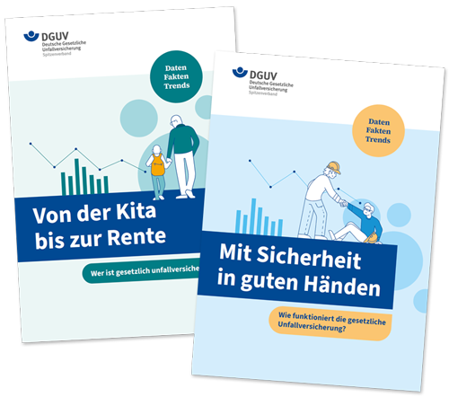 Das andere gibt einen schnellen Überblick über die verschiedenen Versichertengruppen und -zahlen der gesetzlichen Unfallversicherung auf – Beschäftigte, Unternehmen und Einrichtungen, Schülerinnen und Schüler, Studierende, Kinder in Tageseinrichtungen und ehrenamtlich Tätige. Zum Faltblatt